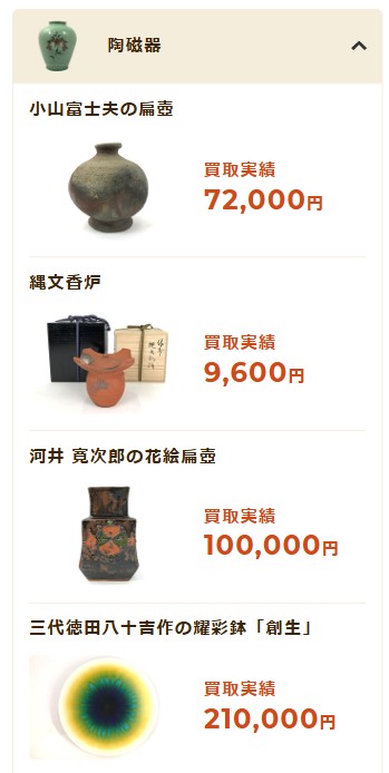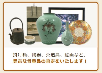 茶道具・掛け軸・絵画・陶磁器・刀剣など幅広い骨董品が買取対象。ただし状態が悪い品は買取できない場合があります。