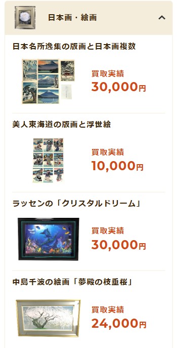 | 買取対象 | ペルシャ絨毯、碁石・碁盤、絵画、掛け軸、人形、香木、茶道具、 壺・花瓶、陶磁器、刀剣、彫刻、中国美術 ※傷・汚れがあっても査定対象 |